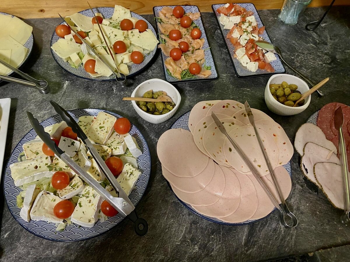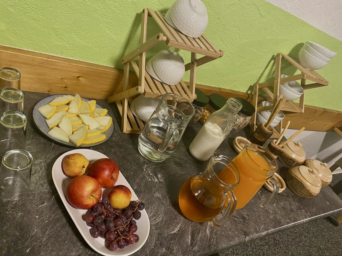 Wir bieten unseren Gästen ein reichhaltiges Frühstücksbuffet mit selbst gebackenem Brot, hausgemachtem Joghurt, Rührei und vieles mehr.