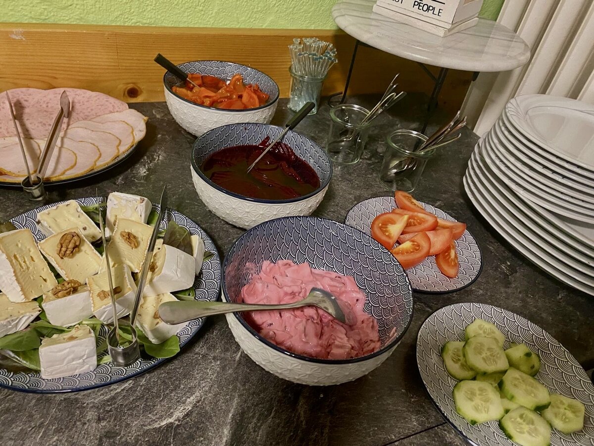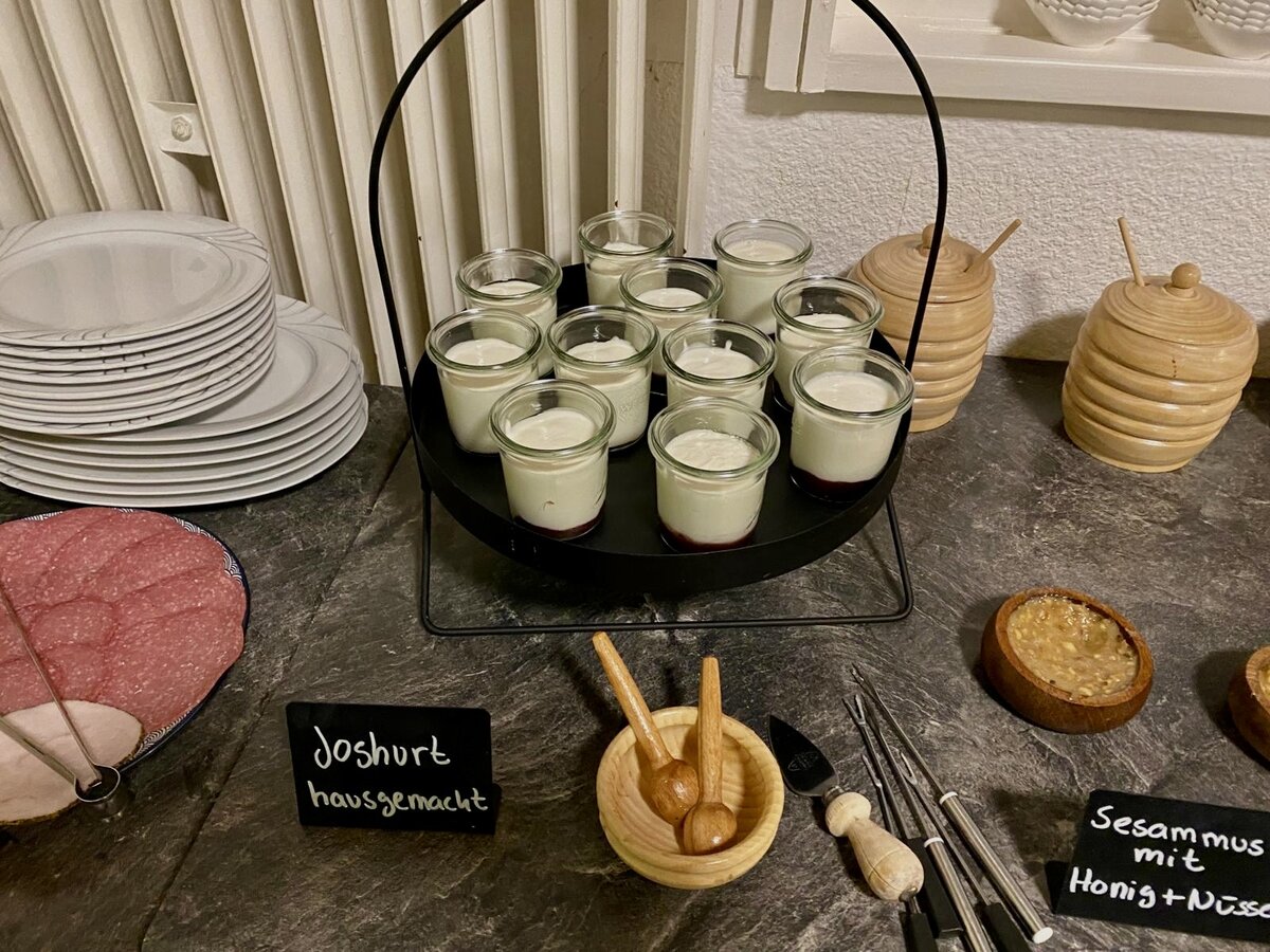 Wir bieten unseren Gästen ein reichhaltiges Frühstücksbuffet mit selbst gebackenem Brot, hausgemachtem Joghurt, Rührei und vieles mehr.